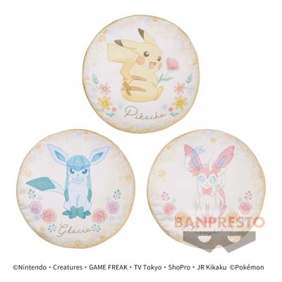 大人気!「Floral Ensembleシリーズ」第4弾は、ピカチュウ、グレイシア、ニンフィアの3種類☆ポケモンたちと花の水彩風デザインがとってもカワイイ丸型のクッションです♪