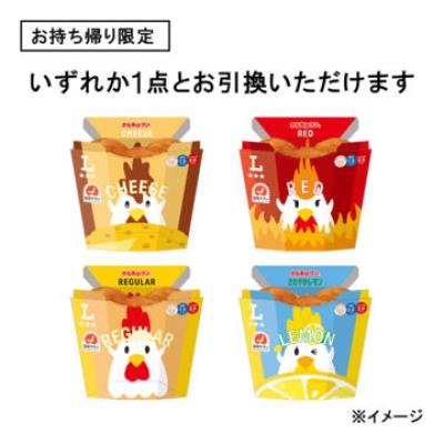 からあげクン4種(税込278円)いずれか1個とお引換いただけるチケットです。からあげクンのレギュラー、レッド、北海道チーズ、さわやかレモン味のいずれか1点とお引換いただけます。