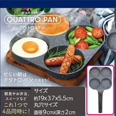 ガス・IH対応クワトロパン 4つ穴のフライパン。一度に4品作れるので、忙しい朝のお弁当作りにとっても便利!フッ素コーティングで焦げ付きにくいが嬉しい! 提供開始日: 2026-01-10 09:00:00 Tweet