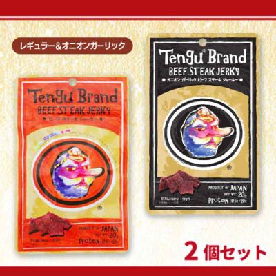 良質なステーキ用の牛肉を使用し、醤油で味付けしたこだわりのビーフジャーキー。今回はオニオンガーリック味もセット。ビーフジャーキーといえば「テング」ブランド。是非ご賞味を。